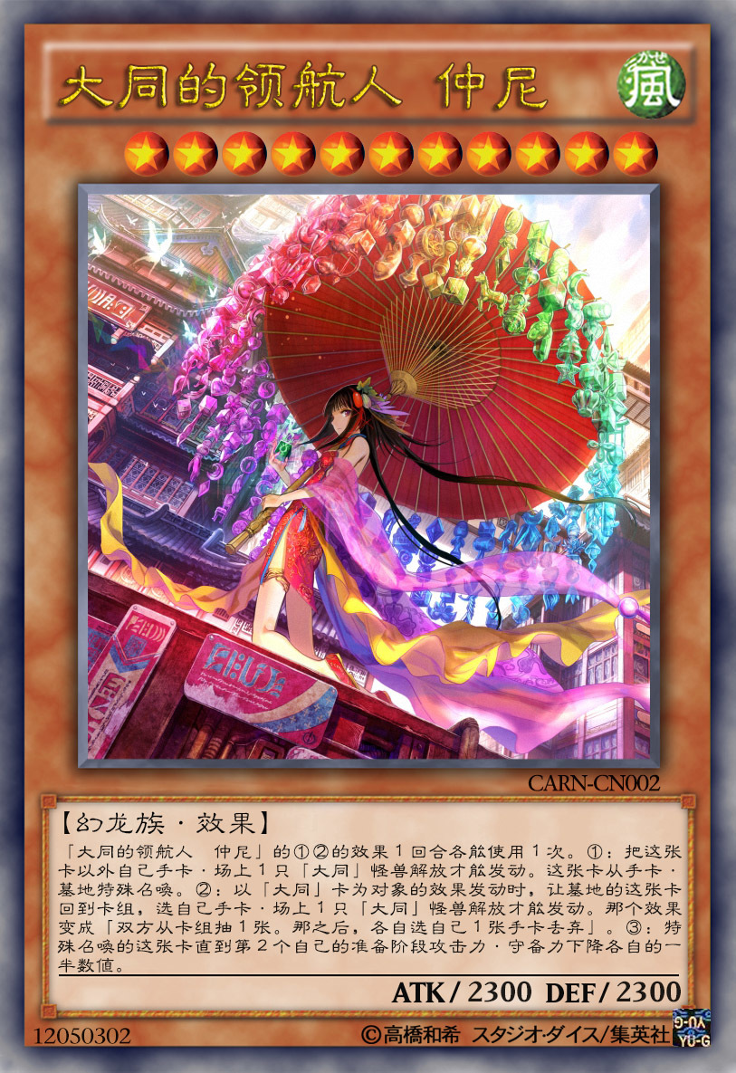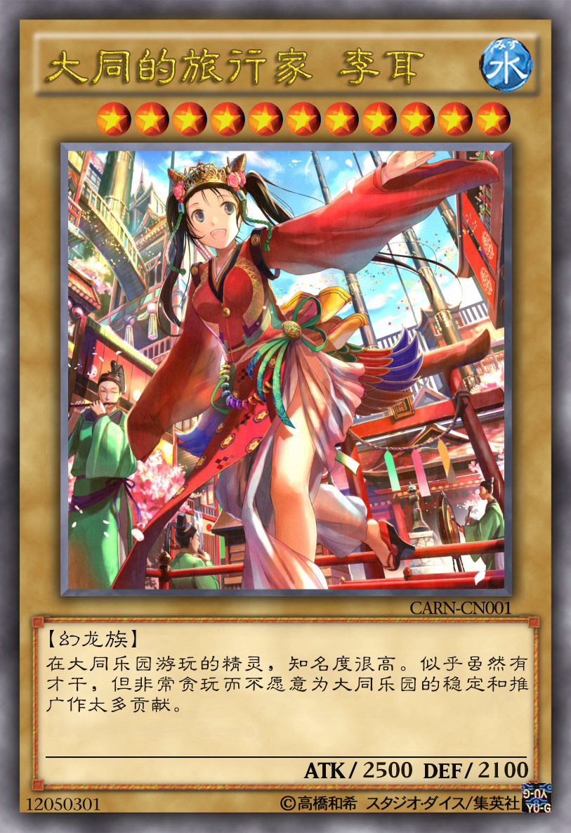 Part 2. 单卡卡图和介绍(其中CN019-021为评选结束后制作的补充卡) “我就来玩会,没事别叫我,有事也别叫我~噫~” CARN-CN001 大同的旅行家 李耳 [图片] 此卡的效果:“特殊召唤不减攻”。噫。 能被本家魔陷特招的2500打手,各种被抽上来丢下去的存在,详情参照圣刻的拉长。噫。 “为了不被过于强大的抑制力克制,才会有我们现世时需要时间来恢复能力的设定,这些礼记的限制都不会是无缘无故的,为何他们无法理解呢……” CARN-CN002 大同的领航人 仲尼 [图片] 最灵活的处理手札大同怪的方式,精堆第一对象。攻防均衡,也就是战力都不咋的。 改命技…